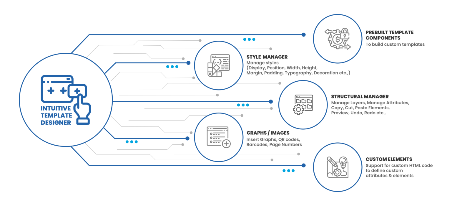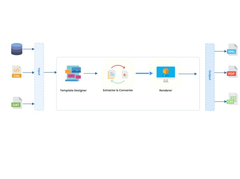 Processes any input format (JSON, TEXT, DAT, XML) and delivers output in PDF, AFP, XML, and CSV, all while seamlessly handling multiple languages and currencies.